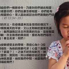 主的恩言 我賜給你們一條新命令,乃是叫你們彼此相愛;我怎樣愛你們,你們也要怎樣相愛。 你們若有彼此相愛的心,眾人因此就認出你們是我的門徒了。(約 13:34-35)