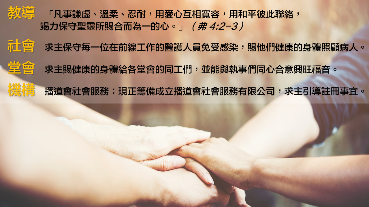 堂會 求主賜健康的身體給各堂會的同工們,並能與執事們同心合意興旺福音。