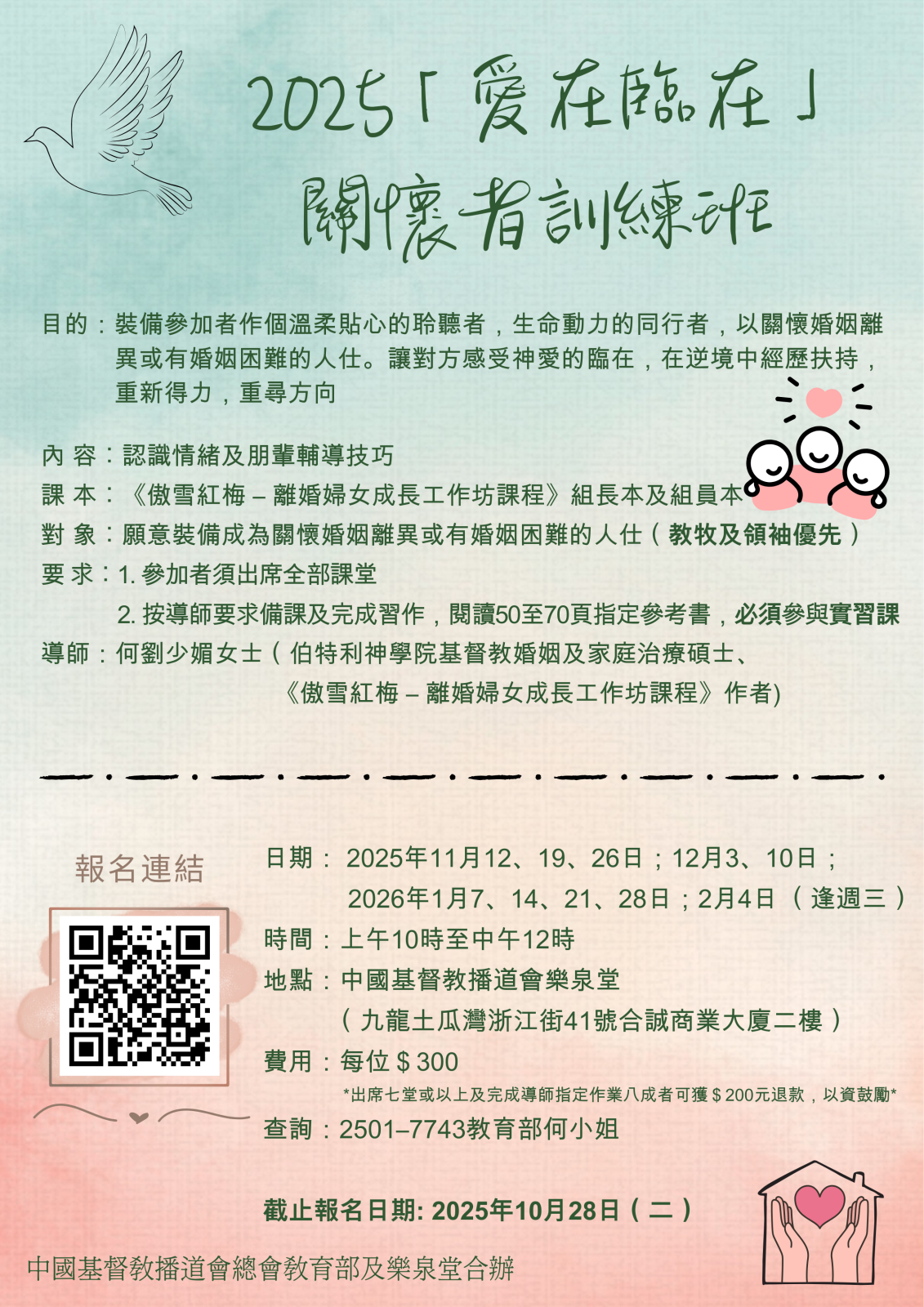 對象:願意裝備成為關懷婚姻離異或有婚姻困難的人仕(教牧及領袖優先)