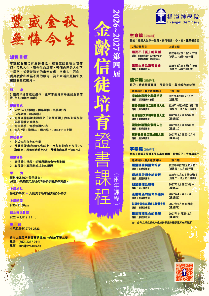 敬請積極考慮,並推介給教會合適的弟兄姊妹,鼓勵有志委身事奉主的金齡信徒報讀。