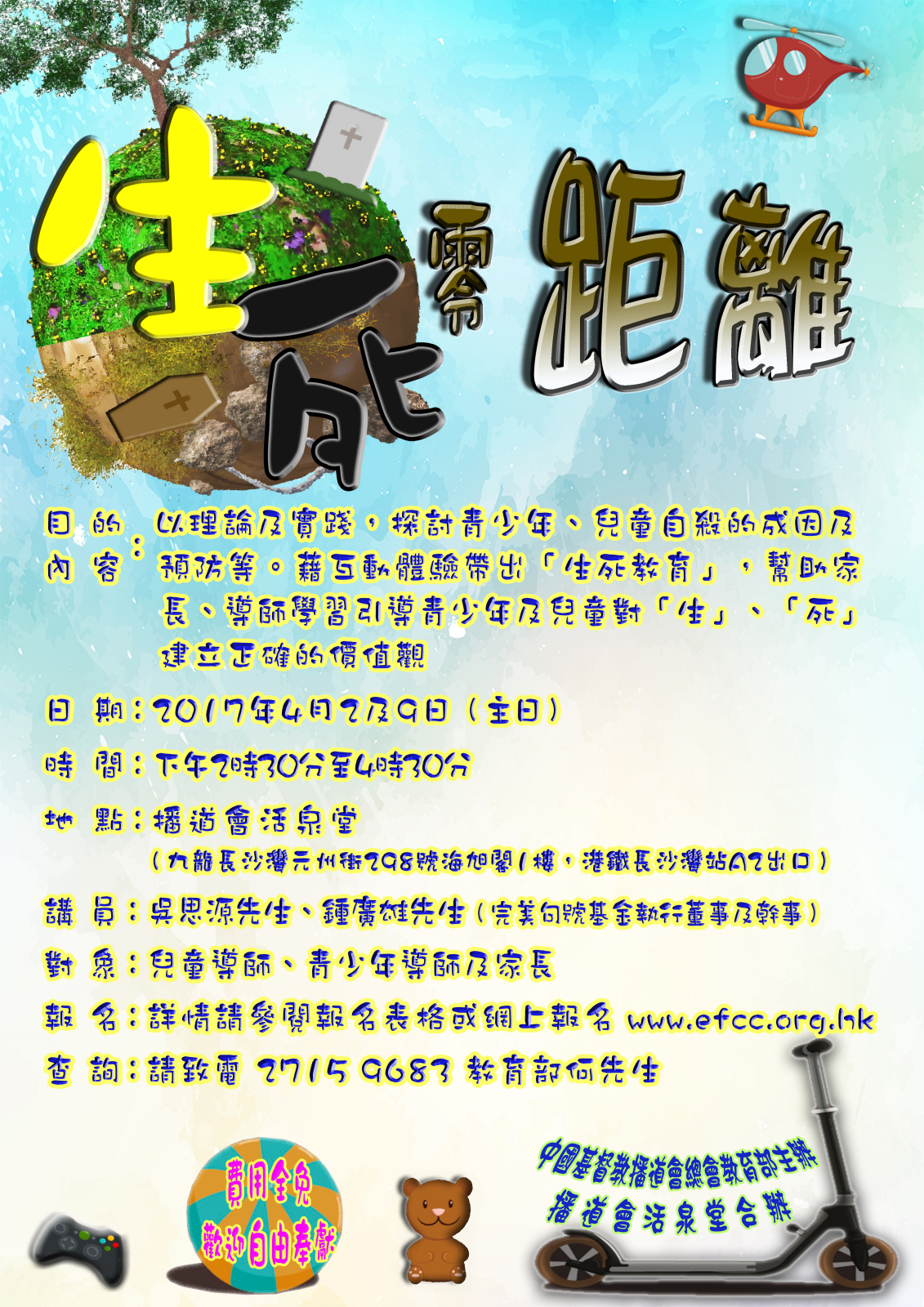 目的及內容︰以理論及實踐,探討青少年、兒童自殺的成因及預防等。藉互動體驗帶出「生死教育」,幫助家長、導師學習引導青少年及兒童對「生」、「死」建立正確的價值觀