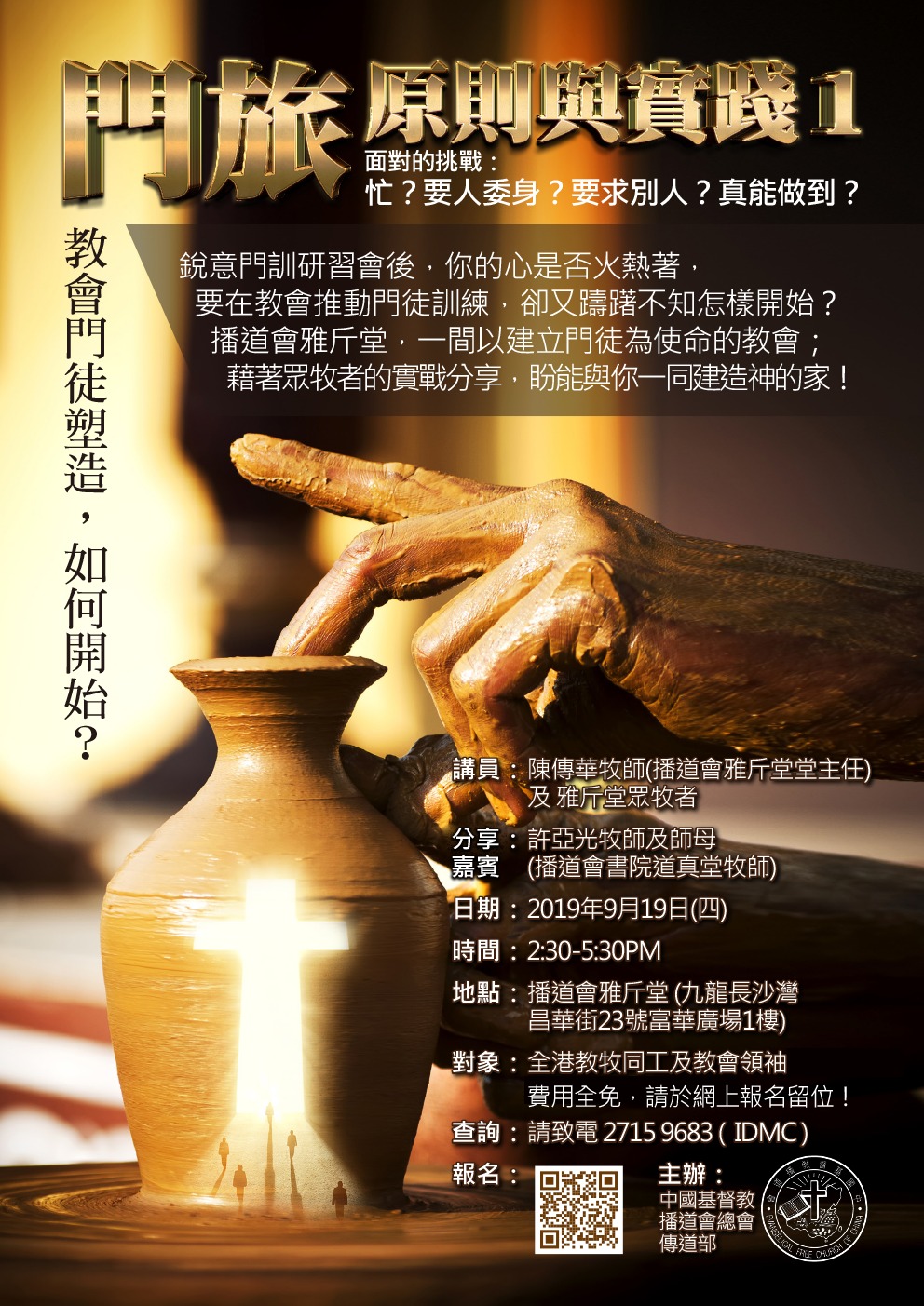 講 員:陳傳華牧師(播道會雅斤堂堂主任)及雅斤堂眾牧者 分享嘉賓:許亞光牧師及師母(播道會書院道真堂牧師) 日 期:2019年9月19日(四) 時 間:2:30-5:30PM 地 點:播道會雅斤堂(九龍長沙灣昌華街23號富華廣場1樓) 對 象:全港教牧同工及教會領袖 收 費:費用全免 報 名:按此