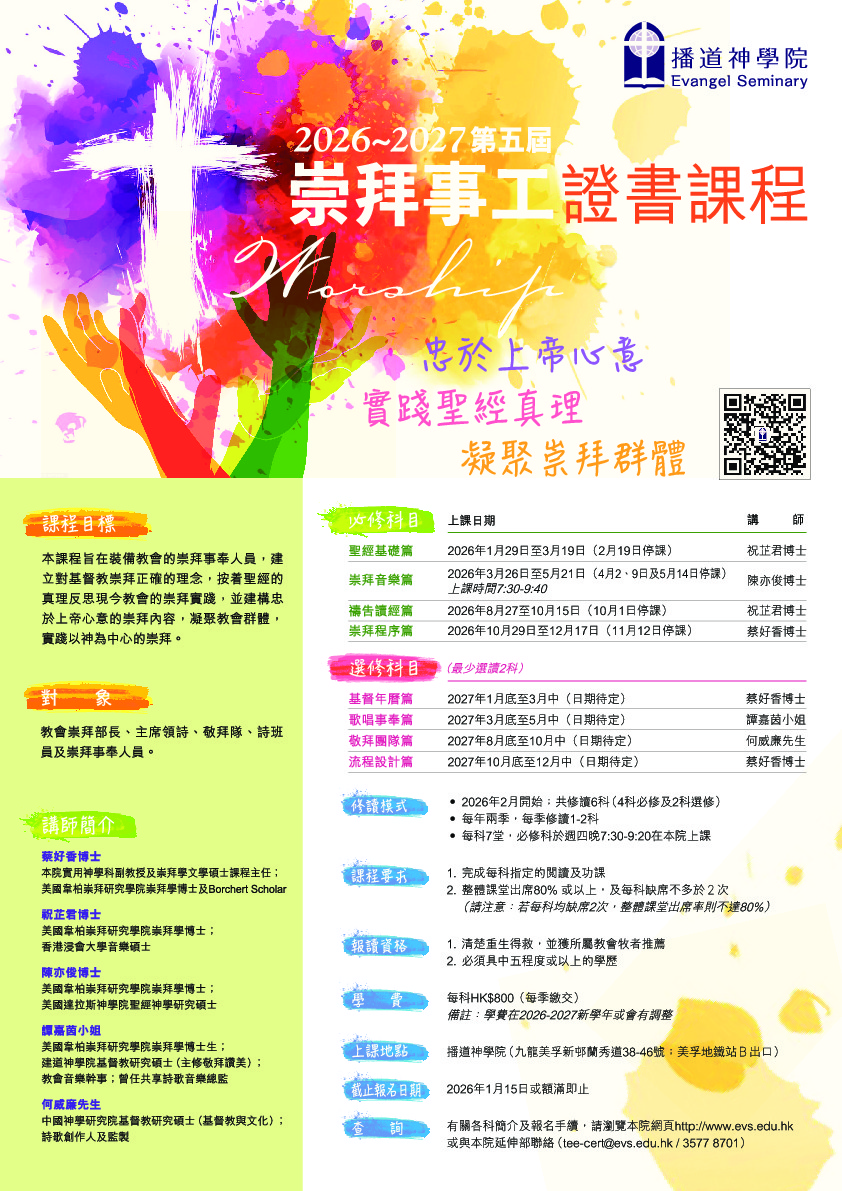 敬請積極考慮,並推介給教會合適的弟兄姊妹,鼓勵有志委身 崇拜事奉 的信徒報讀。