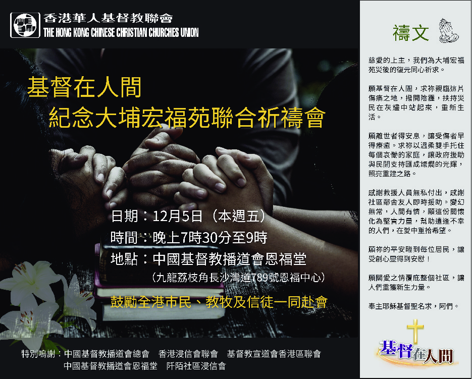 日前大埔宏福苑火災,奪去過百人性命,過千災民家園盡毀,無家可歸。播道會、宣道會和浸信會(三宗)領袖,有感在這艱難時刻實在需要祈禱,於是聯同香港華人基督教聯會於2025年12月5日(星期五)晚上7:30,在本會恩福堂舉辦「宏福苑聯合祈禱會」,呼籲全港信徒出席,一齊為城市守望,為哀傷患難中的人祈禱,鼓勵團契一同出席。
