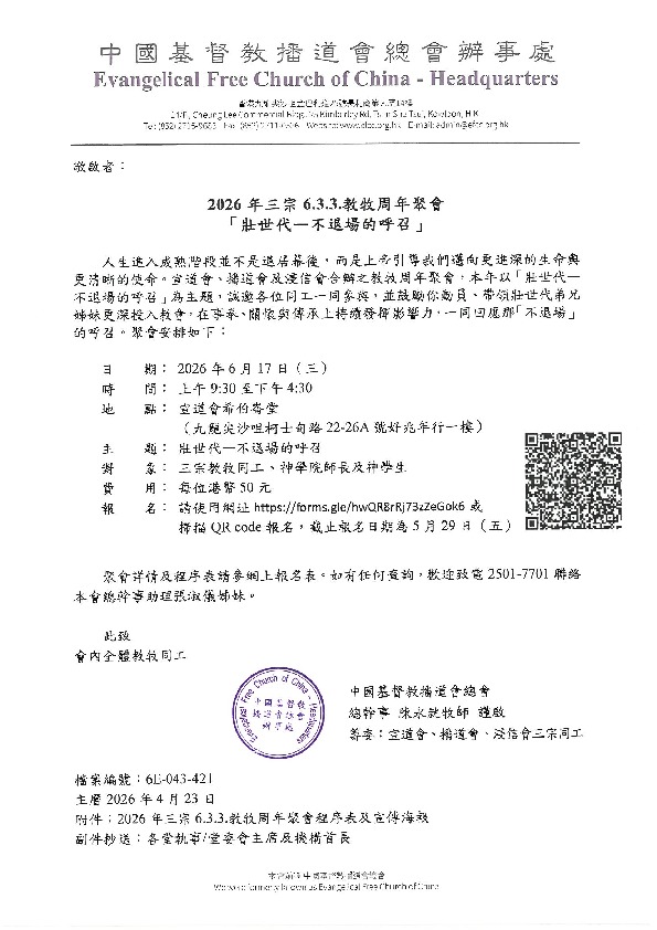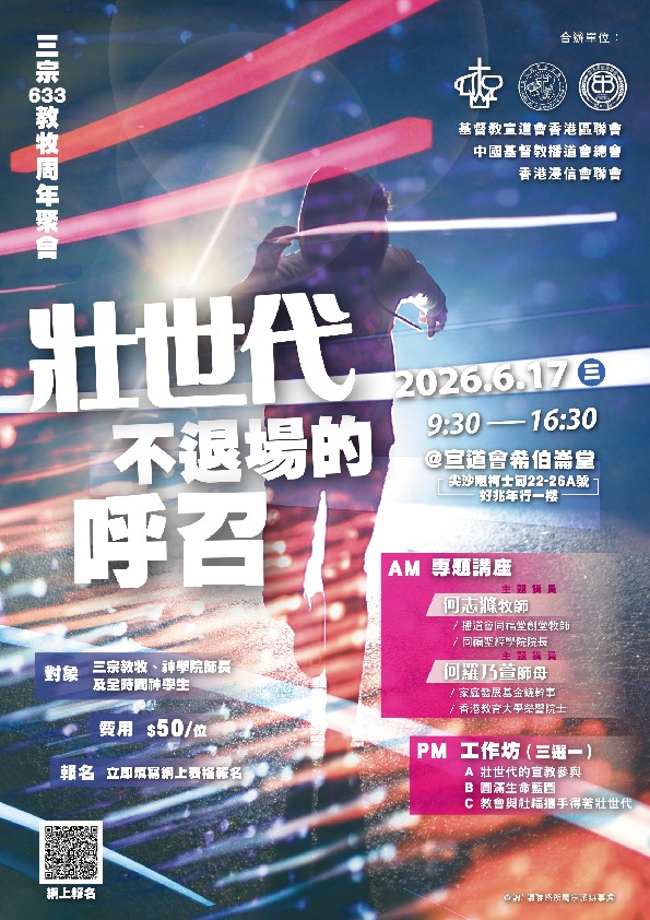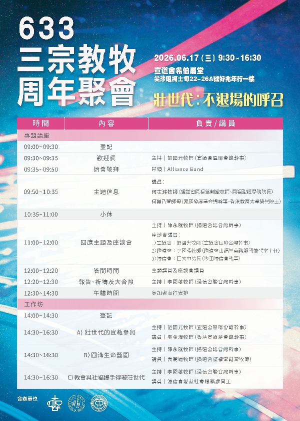 宣道會、播道會及浸信會合辦之教牧周年聚會,本年以「壯世代—不退場的呼召」為主題,誠邀各位同工一同參與,並鼓勵你動員、帶領壯世代弟兄姊妹更深投入教會,在事奉、關懷與傳承上持續發揮影響力,一同回應那「不退場」的呼召。聚會安排如下: